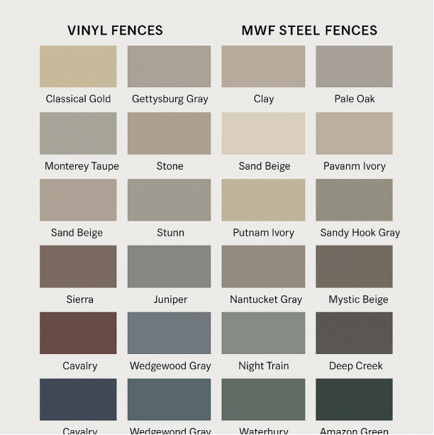 Here is the combined visual color chart for Vinyl Fences and MWF Steel Fences using